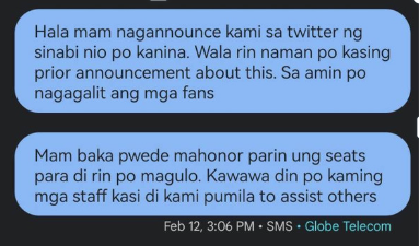 12 February, 2:00 pm: Red Knights Crowd Management Services, a crowd control management hired by Wilbros for the event, informed us that they will not be honoring the UQN we were issuing. They claimed they were not informed by Wilbros about this and refused any help from the staff. The security was also insistent that it was their job to handle the queueing. Since tension was clearly becoming evident, our admin reached out to a WL staff and explained the issue. Unfortunately, there was a miscommunication between Wilbros and the security regarding the UQN. While our admin reasoned that a different WL staff approved it via Twitter DM, the said staff did affirm to do something about the situation.