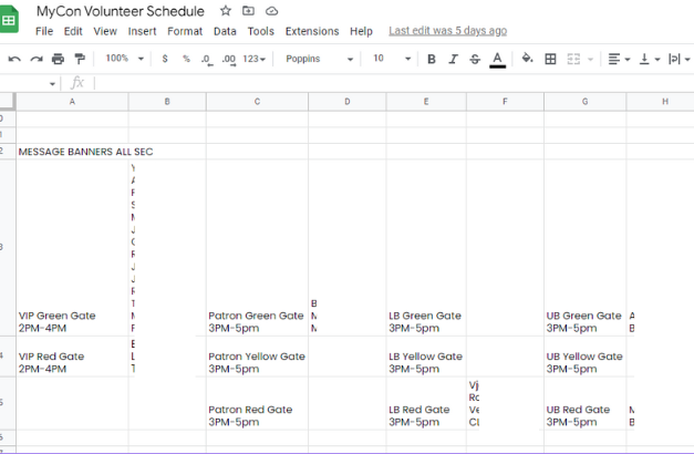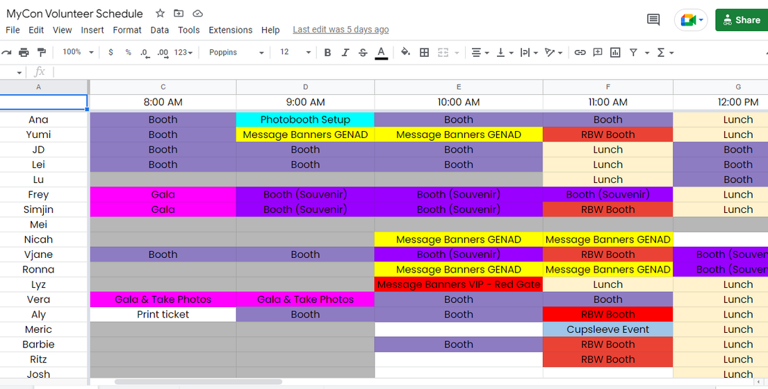 We created this timetable (as shown above) to take note of the preferred tasks of our staff and volunteers. As we do not want to demand their whole pre-con time for banner distribution and booth duties, and to consider that they may have other engagements during that time (like CSE, freebies, meet-ups, etc.), we let everyone choose their schedules.