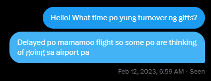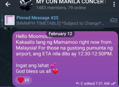 The initial information received was that they would be arriving at 5:00 am. Team Airport was supposed to meet up at 2:00 am at the nearest fast food restaurant but we have received information that their departure from Kuala Lumpur, Malaysia would be at 8:00 am, which would make their arrival at NAIA around 12:00 nn. Because of this, the tarpaulin and banners were not used as we, the admins and volunteers who were in charge of distributing the cloth banners to Team Airport, should have to be at Araneta by 8:00 am for their assigned tasks. However, once we have confirmed the flights of our girls, we quickly disseminated the information to everyone through our Telegram Chat.