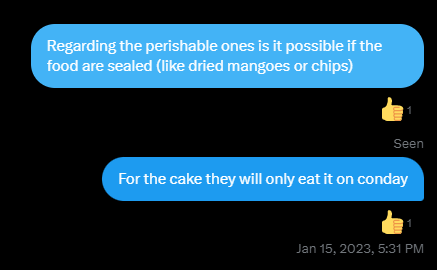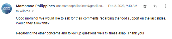 MMMPH asked WL about giving food support to Mamamoo and RBW staff. On 15 January, we were advised not to send food or perishable items as these would [en verbatim] "just go to waste." Cake, however, was approved but they won't be able to bring and consume it.
