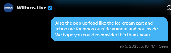 We also sent a follow-up message to Wilbros more than once via email and DM regarding the projects, but we were discouraged from pursuing it. Wilbros told us that we don't need to send food because they [en verbatim] "spoil their artists," and already provided catering services backstage.
