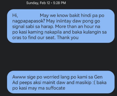 12 February, 5:00 pm: After soundcheck, VIP moos were ordered to exit the venue and wait for further announcements. After more than an hour of waiting, MMMPH Admin contacted WL Staff. She answered that they are actually waiting for RBW's go signal as well. MMMPH Admin also relayed the complaint of a Gen Ad Moo that their area is overcrowded and lacks proper ventilation.