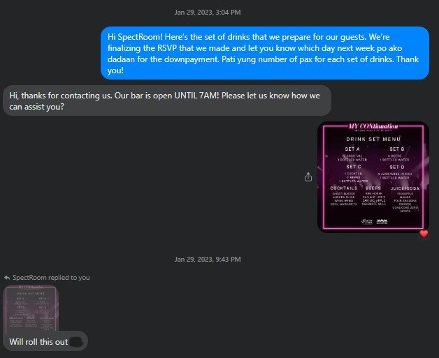29 January, 3:00 pm: MMMPH provided a copy of the drink set menu to SpectRoom through Facebook Messenger so they could prepare accordingly.