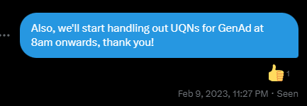 09 February: To ensure order and peace for the Gen Ad section attendees, MMMPH asked about issuing Unofficial Queuing Numbers (UQNs), to which WL approved (as shown below). We also informed them that we will be issuing UQNs starting at 8:00 am onwards on D-Day.